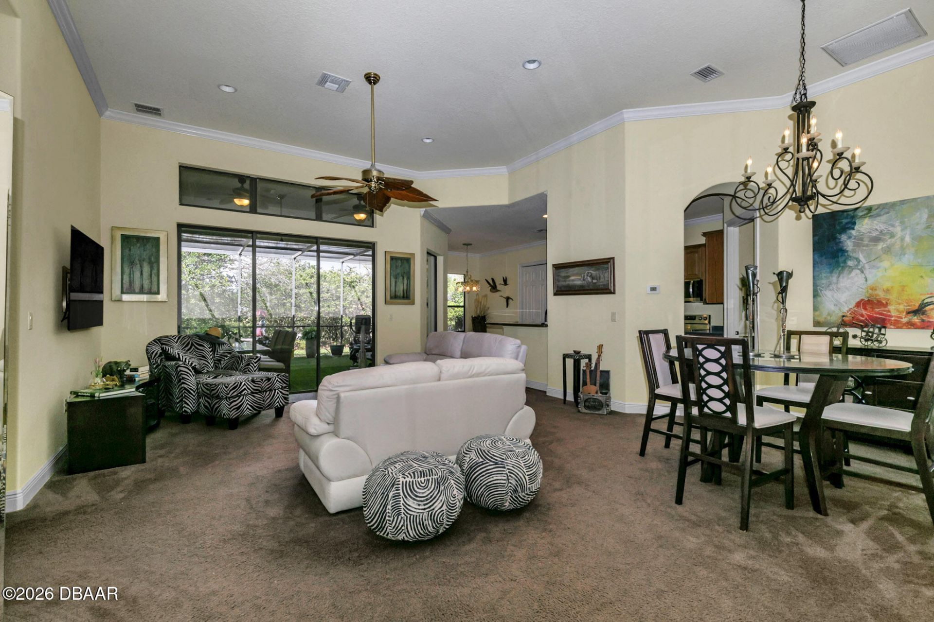 Welcome to The Grove at Harbor Hills, a gated, non-age restricted, golf cart-friendly enclave within 10 miles of The Villages. This three-bedroom, two-bath residence with an additional den offers 1,972 square feet of well-designed living space. Built in 2007 with updates in 2025 to include a new roof, HVAC system, water heater, stainless steel appliances and refreshed sod in the front yard. Beautiful crown molding installed throughout the home in March 2026 add elegance to the soaring ceilings and abundant natural light. Formal living and dining areas flow into informal spaces ideal for entertaining or daily comfort of your own. Oversized sliding glass doors open to an expansive screened lanai--partially covered and set against a serene backdrop of privacy-enhancing landscaping.The split-bedroom floor plan includes a primary suite with two walk-in closets and a private bath. A secondary bedroom also features a walk-in closet while the third bedroom has a standard closet. The den provides flexible space for a home office, reading room or creative studio. Curb appeal is enhanced by manicured landscaping, an underground irrigation system and a brick-paved driveway. The low quarterly HOA fee of $242.55 includes guarded gate access and maintenance of community grounds. Residents may also elect to join the Harbor Hills amenities program for a separate fee, which offers access to a marina, golf course, clubhouse, pool, gym, pickleball and more. The views from the clubhouse overlooking the golf course and lake are sure to impress its next homeowner. Home is being sold partially furnished. Golf cart in garage is negotiable.